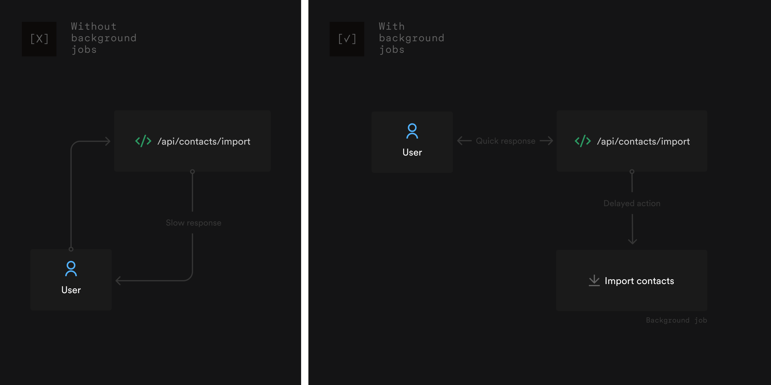 4. User gets an immediate response: The API can quickly respond to the user (e.g., "Import started!"), keeping the UI fast and responsive.